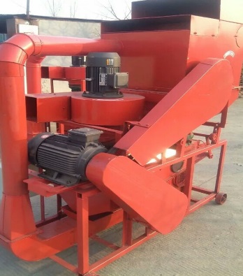 3、花生粒及破碎的花生壳在转子的旋转风压及打击下,通过一定孔径的筛网(花生第一次脱粒用大孔筛网,清选后的小皮果更换成小孔筛网进行第二次脱壳),这时,花生壳、粒受到旋转风扇的吹力作用,重量轻的花生壳被吹出机体外。
